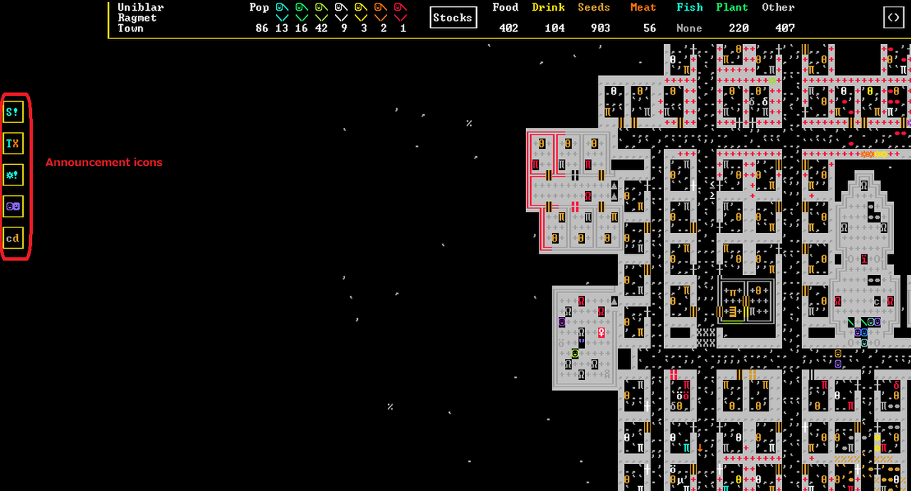 Another issue is that the Steam ASCII version does not display any of the announcement notifications on the left side. They still exist, you can mouse over them to see the tooltips, but there is nothing there and no way to know that one has come up. The only exceptions are the big alert boxes.