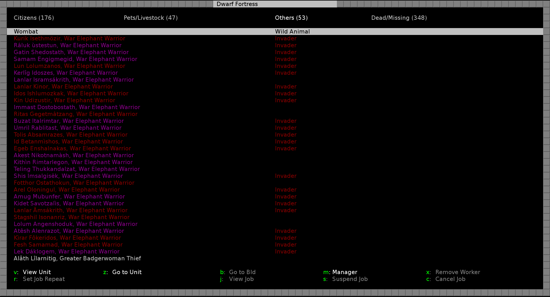 To put things in context, I'm maintaining a military of 90 dwarves (50 melee, 40 markmen), over half the size of my population, with the added challenge of not using traps and defending an outdoor open courtyard. And it's really challenging.