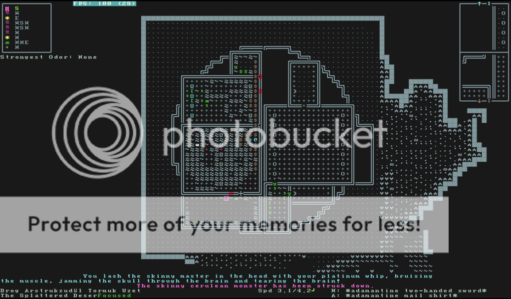 So I went to that human bandit camp again (found some empty lair on the way this time), talked with the commander there for a bit and then bolted towards the Gakit's place to the west to test my drogoth's thoughness. I was satisfied to find out that Gakit's attacks just glanced away and the only way the bastard could do any damage to my nudist was when he grabbed her and threw her like 6-10 squares away, smashing the skin on the ground but the damage levels were still in the brown which seems to indicate that they'll heal, and fast they'll heal on a drogoth. Took but a few moments to crack and bash and smash it's skull into it's brain and kill it.