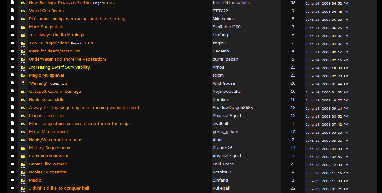 Oh, my biggest issue now is the Search. I'd like to search for all posts by a user in the last 15 days, but Search requires a keyword. And you can't use "the" or "a", or search for all posts without asparagus. I tried searching for Dwarf, but it seemed like there should be more. It was slower than the old search, and the results were bloated. I just need a list of topics and post #, like before.
