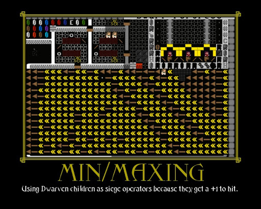 While filtering through my motivators of duplicates (and there's a freaking ton of them), I came across a poster that motivated me to try out DF (outside the Boatmurdered story; plus there were some posters mentioning that as well).What's min/maxing again?Spoiler: Here it is: (click to show/hide)