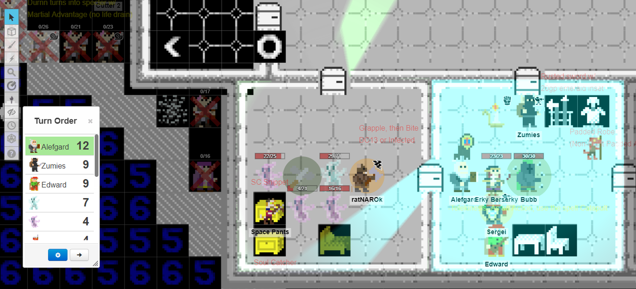 "Four, thank you, nervous lizard chum" said Space Pants. "I'd better see five coin purses total here in... How long is an action? Six seconds."