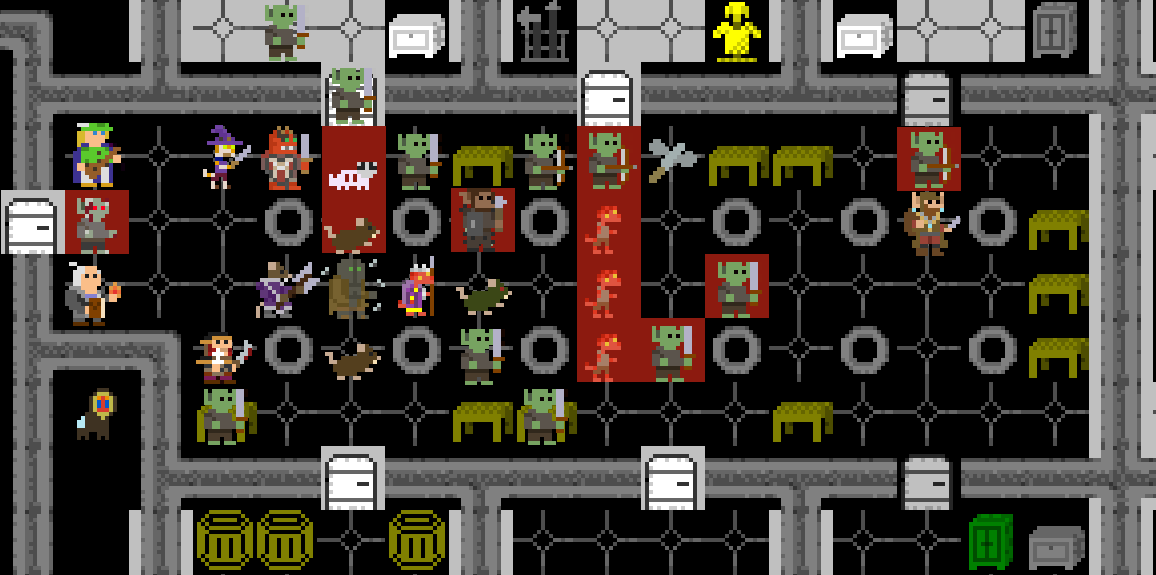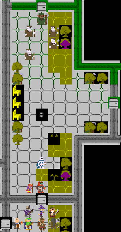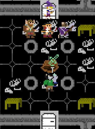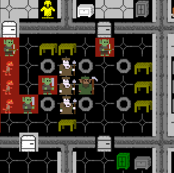 The next room looked very similar to the one they were coming out of. At the other end of the hall was a bugbear with four skeletal gardeners in tow. Their backs were turned. The bugbear seemed to be having trouble opening the north door.
