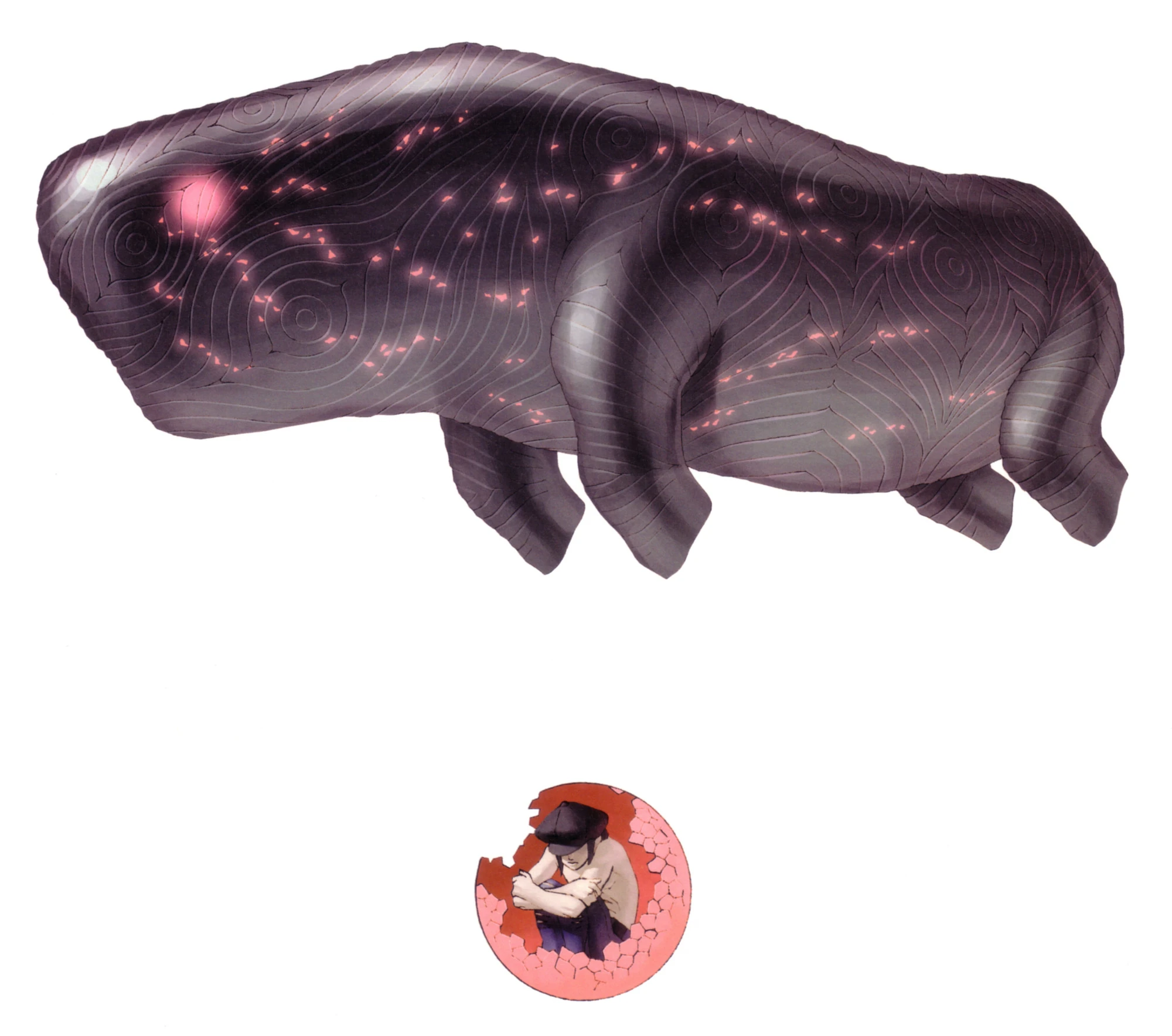 The stage breaks apart, Mayor Hongo and the police officers being thrown aside as the massive Zoanthrope bursts through, a giant, whale-like beast with star-like red lights running through the length of its black hide, which seems a blend between leather, metal and plastic. This Zoanthrope is indeed far larger than any Zoanthrope that has yet to be encountered; most Zoanthropes stand about seven to eight feet tall at the largest, mostly standing around human height, but this Zoanthrope appears to be the size of a house. It releases a high-pitched, keening noise, unfitting of its massive size, as it stomps the ground, seemingly pained as it thrashes around in the remains of the stage it broke apart.