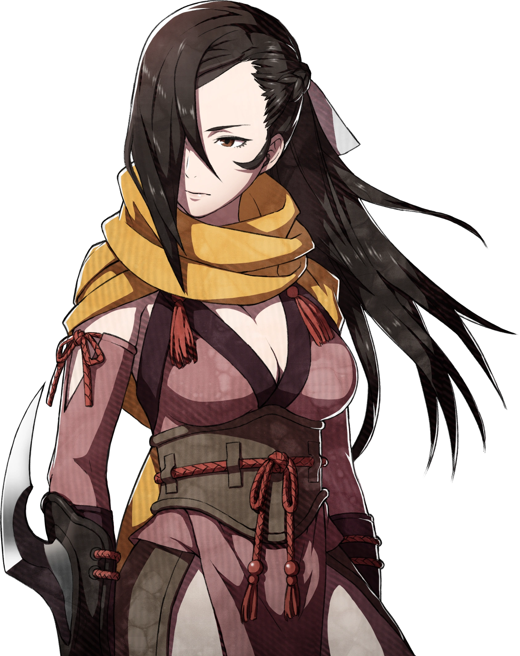 Appearance: Shina is a slender girl with an athletic frame, with olive-toned skin from years of wandering, marked with a few scars from her brushes with death in combat. Her face is small when uncovered, and her eyes are a deep hazel. Her brown hair is tied in a ponytail to keep it out of the way of her bow, and two, brown-furred cat ears mark her out as not being human. Her clothing is quite plain, with russet and brown tones and thick leather boots. A reddish scarf is wrapped around her neck to protect it from the heat or cold and held tight with a brooch in the shape of a crane marking her out as a former member of the army of the Grand Duchy of Edo, with her clothing as rugged as possible while remaining light, and a small quiver hangs at the side of her belt, next to several prayer tags.