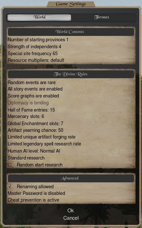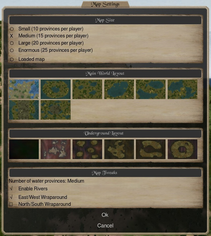 What's this? Not only are there new options for the shape of a random world, there's this "Underground Layout" business. I'm aware that Illwinter has another strategy game ("Conquest of Elysium" I think it's called) which has additional planes that the main terrestrial map connects to (though I've never played it). It seems they've added this feature to Dominions as well, at least for a new underground plane (which is welcome given how terrible the randomly generated cave terrain tended to be in Dom5).