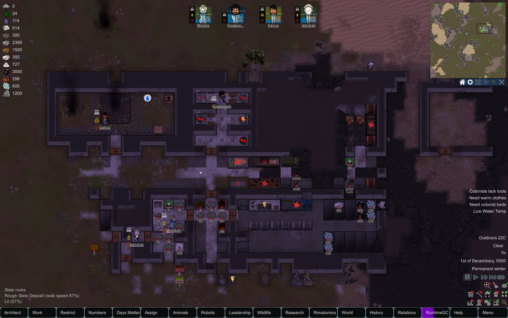 The southern building contains a weird mazelike area, a kitchen covered in rotten mush next to a corridor with nice marble and ceramic slabs also covered in rotten mush and feces, and then there is a big storage room with several work stations and lots of resources lying around. To the east of the two main buildings is a small third building, to the south of them some statues, and in between them a hallway with workshops and a bed.