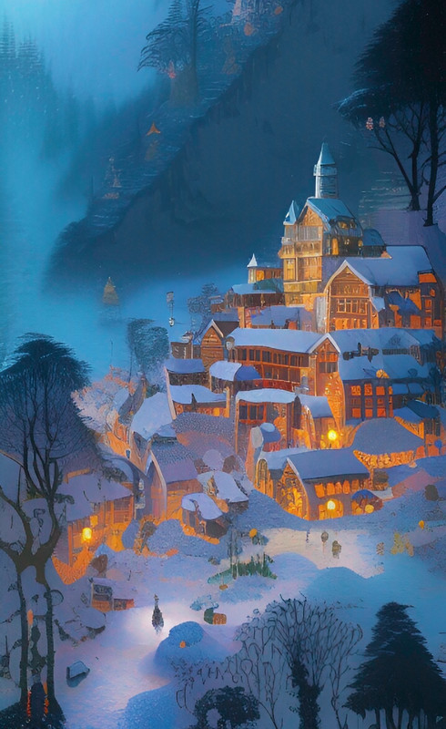 perhaps my favorite part of using real artists as input, is you can sometimes figure out what pieces of art were used by the A.I. nodegraph to build elements. sometimes the A.I. only has impressions of one or two examples of each artist, and the result is that you see the same pattern of style despite differing input, like for instance the same shape of tree present in two images that do not reference trees in their input command