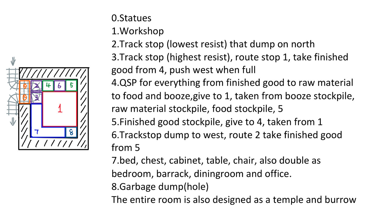 I want over half of my dwarves work on the assembly line, not all of them will be workers, and I think about half of them will in their own hauling room combing or splitting their inputs. The stockpiles outside the assembly line shall be minimum: everything that is produced in the fort aside from mining will be produced form the assembly line, from farming unit to workshop unit to item distribution center (where all the hauler will sort their goods there). The assembly line shall be failry close to each other so that impulse ramp and roller are not required, and push are sufficient.[size=78%] [/size]