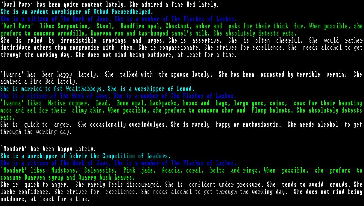 4th Felsite: During the night, three of the newcomer dwarves snuck away from their compatriots, who were slumbering from their drink, and revealed that they were sympathizers with us! Their names are Karl Marx, Ivanna, and Mondark, and we had much to talk about. Karl Marx, in particular, seems to be quite learned on the subject, and talked at length about the philosophical underpinnings. Legolord doesn't seem to like her much.