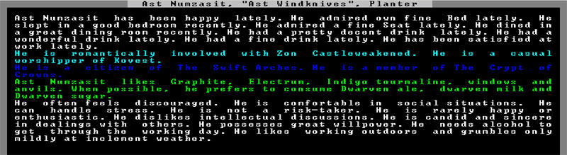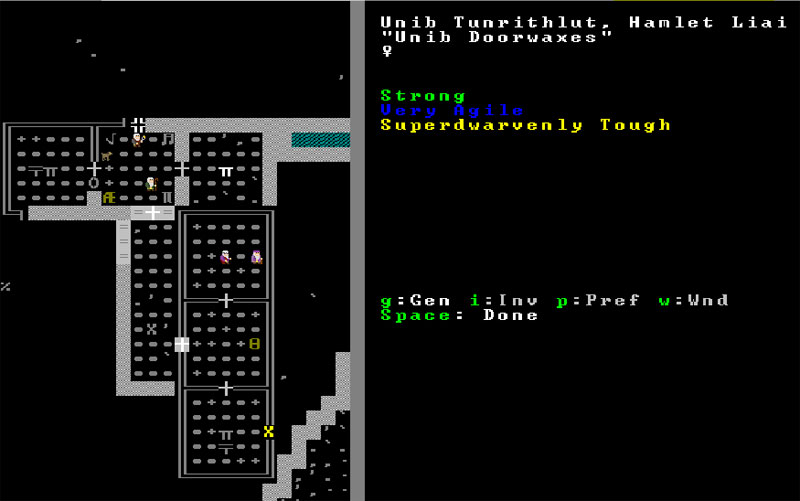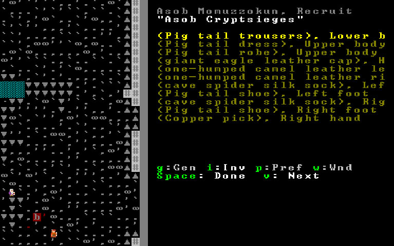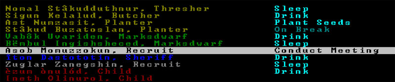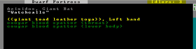 Meanwhile, I've so much time in this pen that is my office that I've officially donned the garb of the Clerk. It's just as well... I mean, so far I've served this fortress as a fisherdwarf, a woodcutter, an axedwarf defending the citizens from the giant bat menace, giving orders, and taking stock. Over time I've learned to take comfort in numbers.