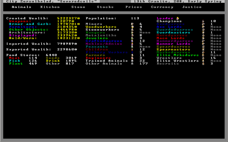 Yet more rhesus macaques swarm in, trying to take some of the goblin loot. I really should let them, just because the workers have been hauling items for half a year now and still aren't any closer to having the yard free of detritus, but it's the principle of the thing! You can't just allow random wild animals to walk in and take things! What does that say about your dwarfiness? I send several militia out to take care of them and gain a little experience. I even kill one myself!