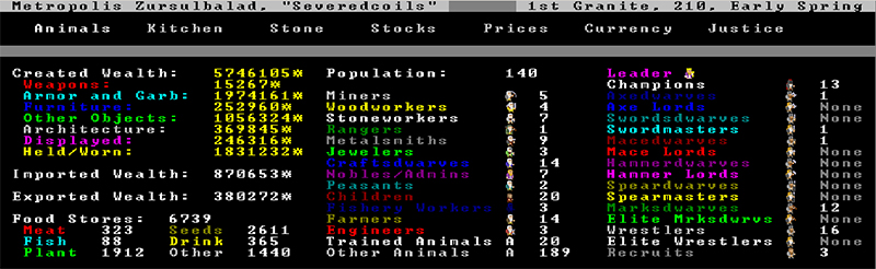 We have three-hundred and thirty-six meat, ninety-six fish, and... one-thousand seven-hundred and thirty-six plants!! Most of this, I think, are wheat products for our cooking industry. We've been creating many barrels, so I set the millstones to repeated milling and the farms to repeated plant processing. Drinks are currently at three-hundred and sixty-five, a pretty good amount, but I set two stills to brewing anyway, and the rest to essence extraction.