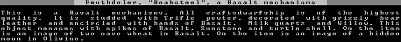 Reg Stillpages, a Planter, is taken by a Fey mood and takes command of a mechanic's workshop. Hmm... There's no mystery as to what he'll make, but I'm not sure what to do with an artifact mechanism. It'll most likely be placed in a room somewhere to increase value. I don't bother with forcing Reg to use the best ingredients - I'm not really interested in his artifact, and it's not like we don't have enough wealth already.