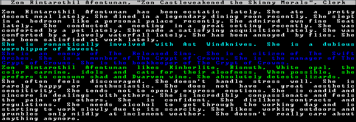 <Ingish pauses a long time with a distant look on his face. He is clearly troubled.> Zon Rimtarothil Afentumam has been ecstatic lately. She ate a pretty decent meal lately. She dined in a legendary dining room recently--