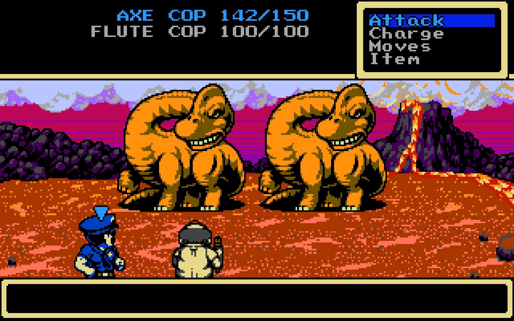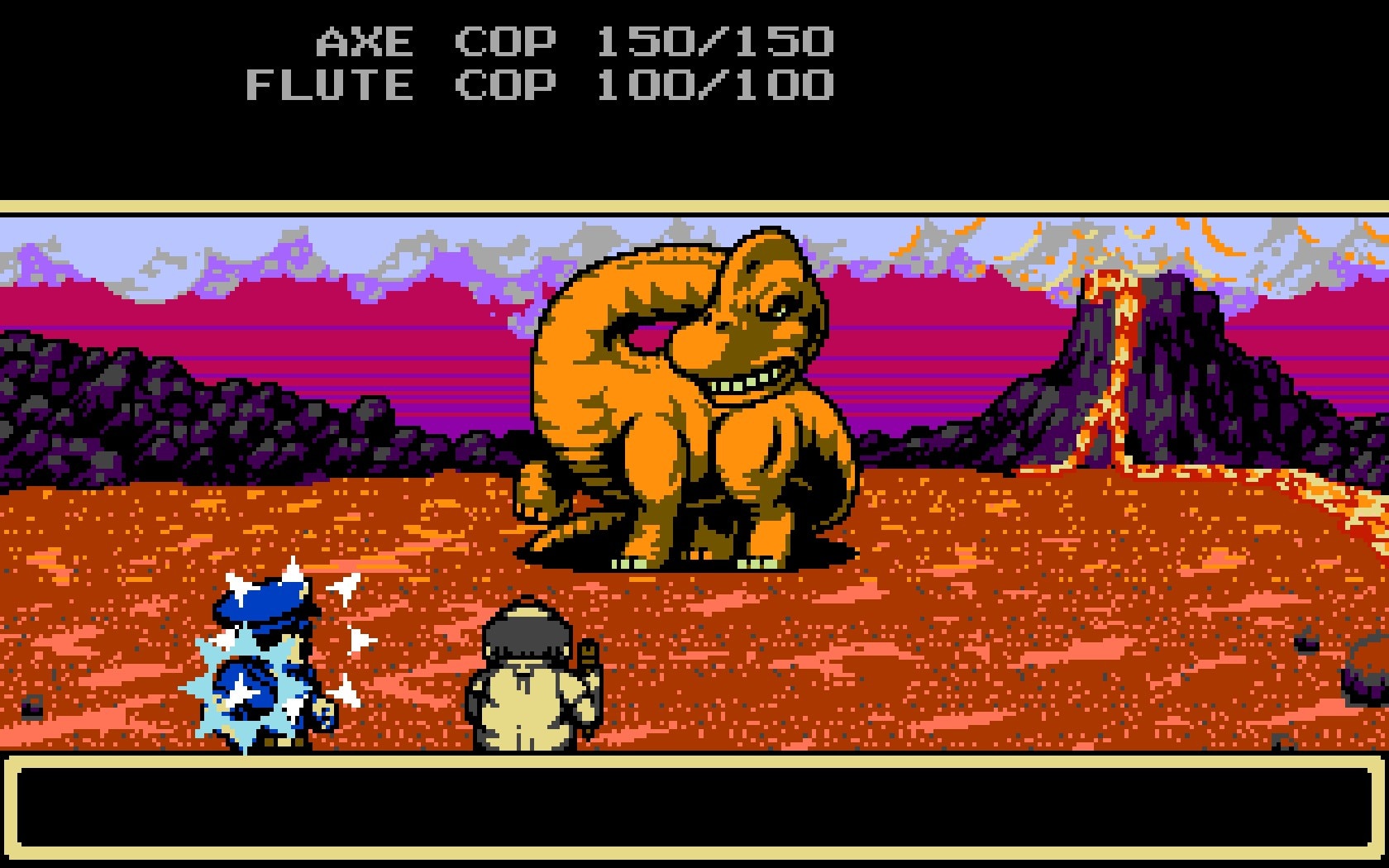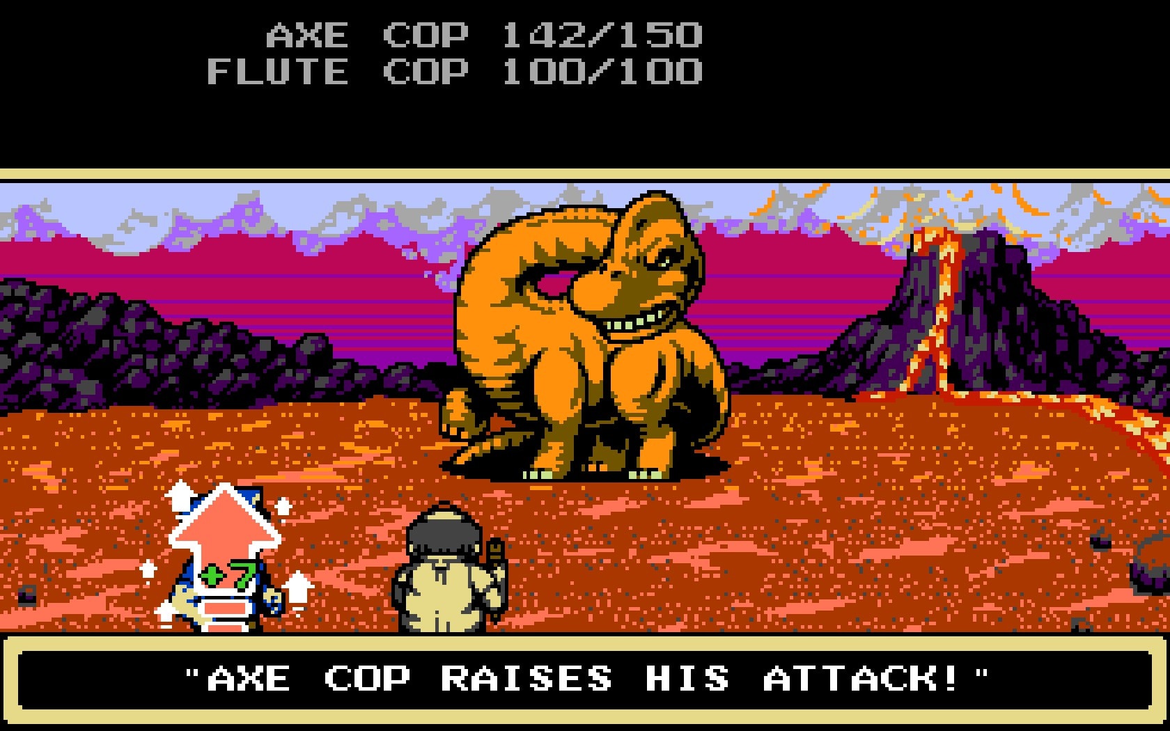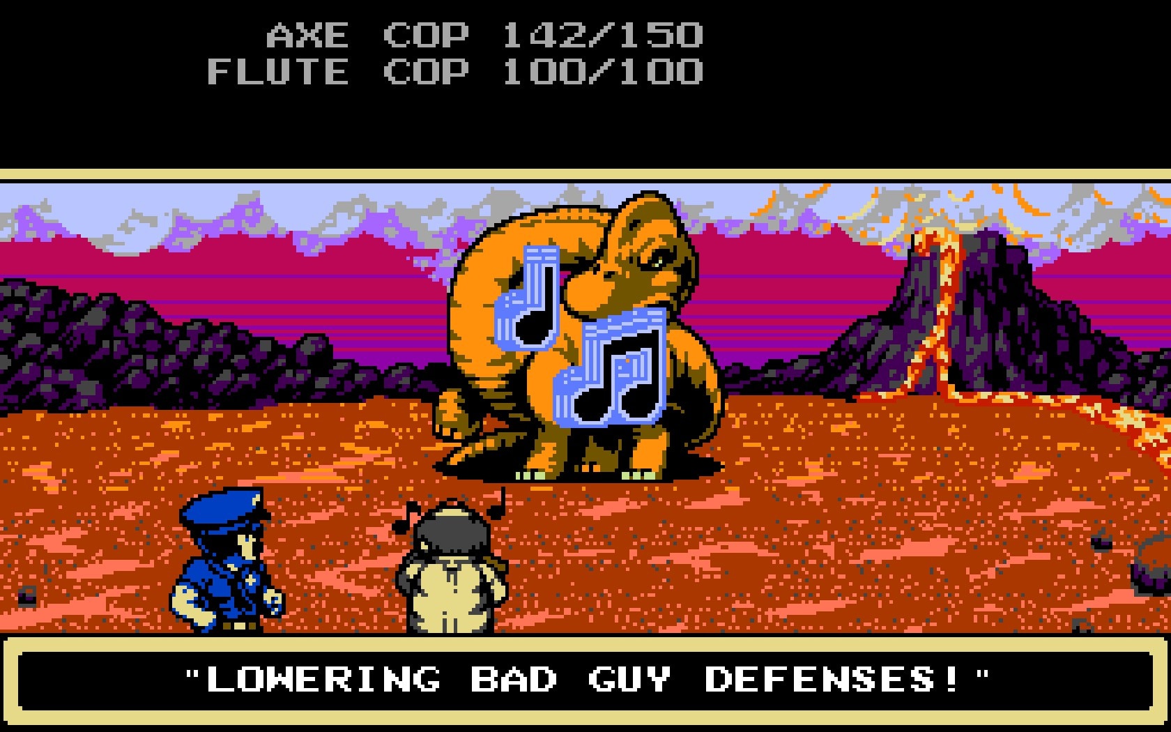 After this it appears I forgot to do the other moves, as I used the Attack commands on both Good Guys. Axe Cop is the larger damage number at 30; Flute Cop's attack is to bonk the Bad Guy with his flute, so it only does 14 damage. It is enough to finish off the Brontosaurus, however.