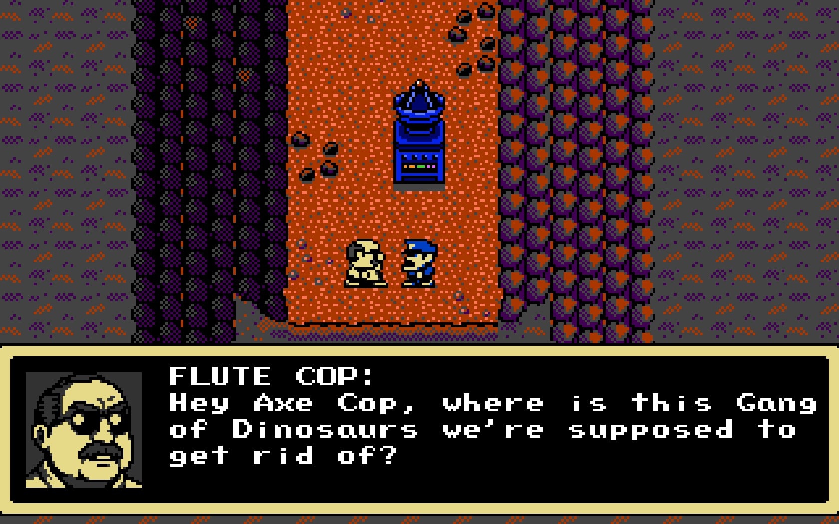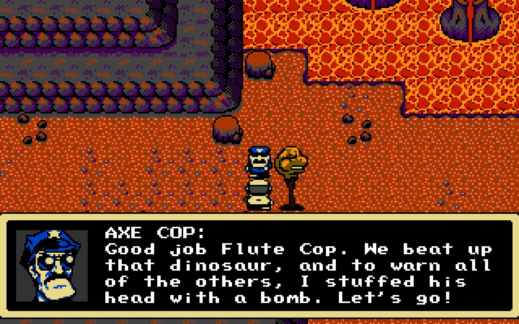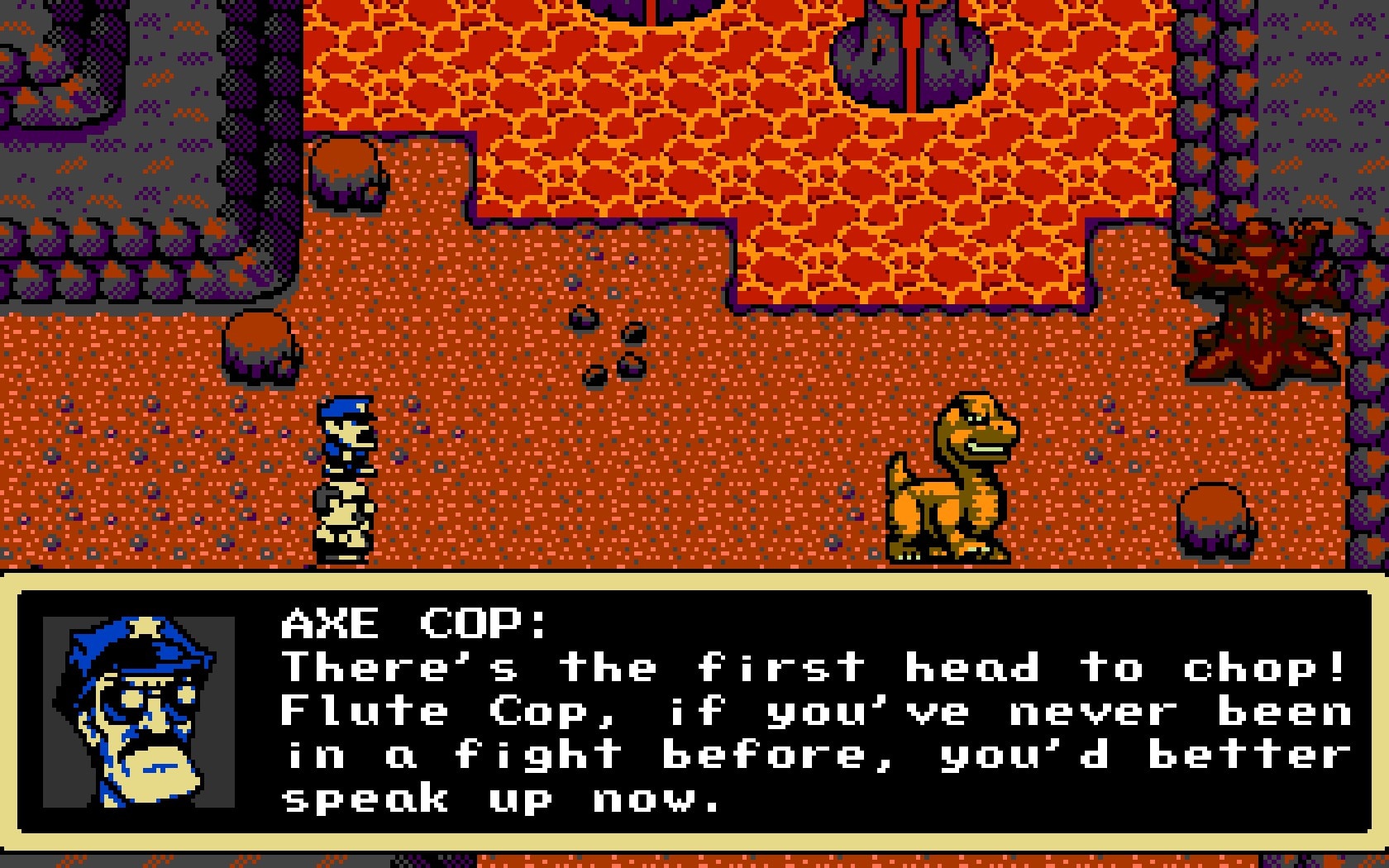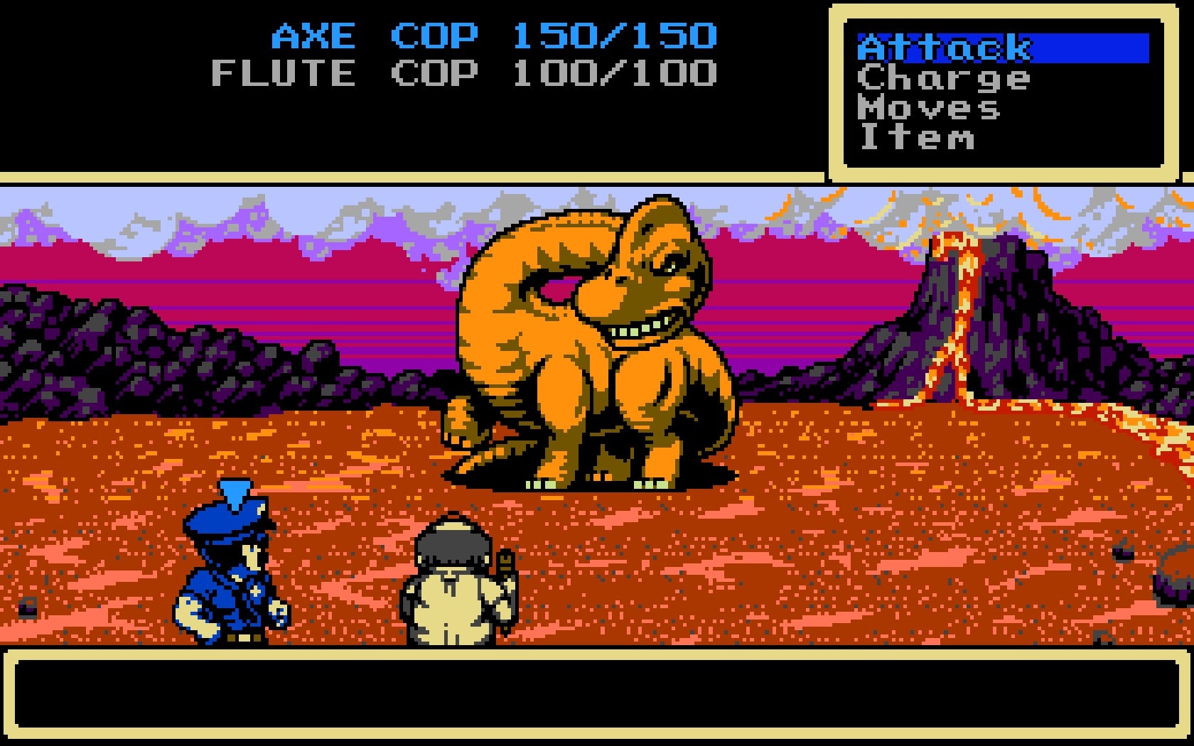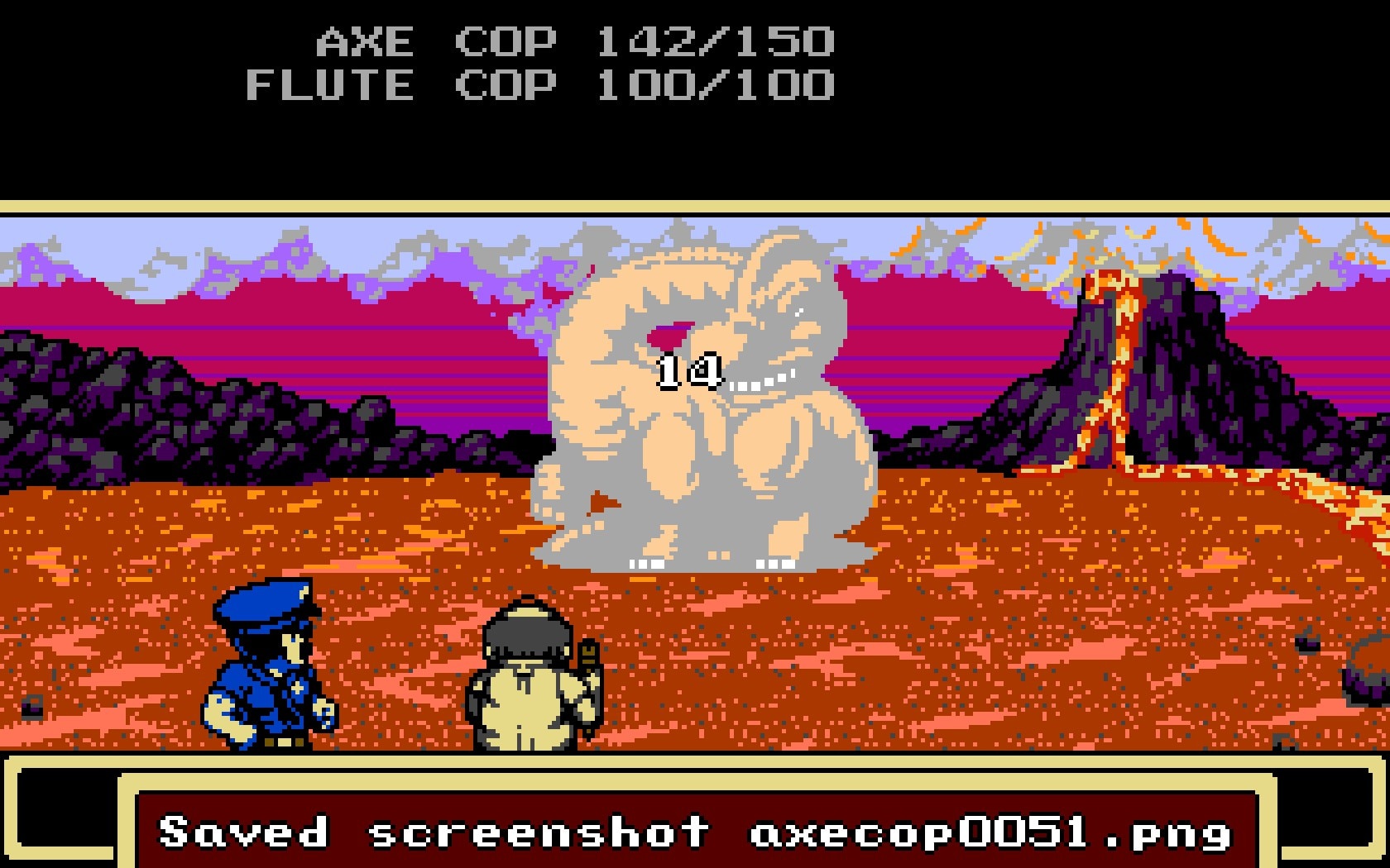 After this it appears I forgot to do the other moves, as I used the Attack commands on both Good Guys. Axe Cop is the larger damage number at 30; Flute Cop's attack is to bonk the Bad Guy with his flute, so it only does 14 damage. It is enough to finish off the Brontosaurus, however.