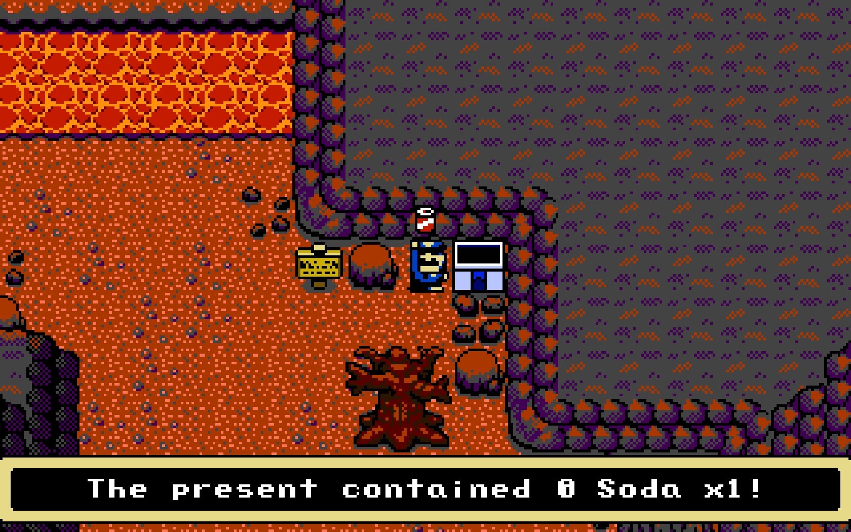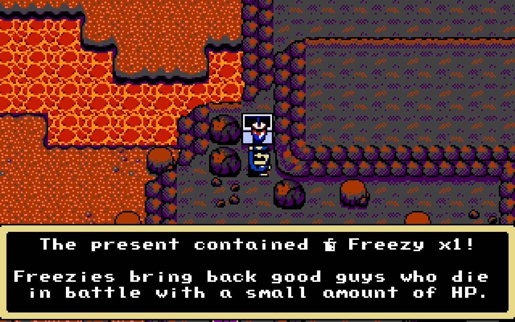 After some exploring, the Good Guys find this. It's like a Slushie except instead of slowly killing the imbiber it instead brings them back from death (from dehydration? still not clear if Health or Hydration points) with a small amount of Hydration points. You can tell it must be a good flavor because it does that plus it hasn't melted inside this dinosaur volcano.
