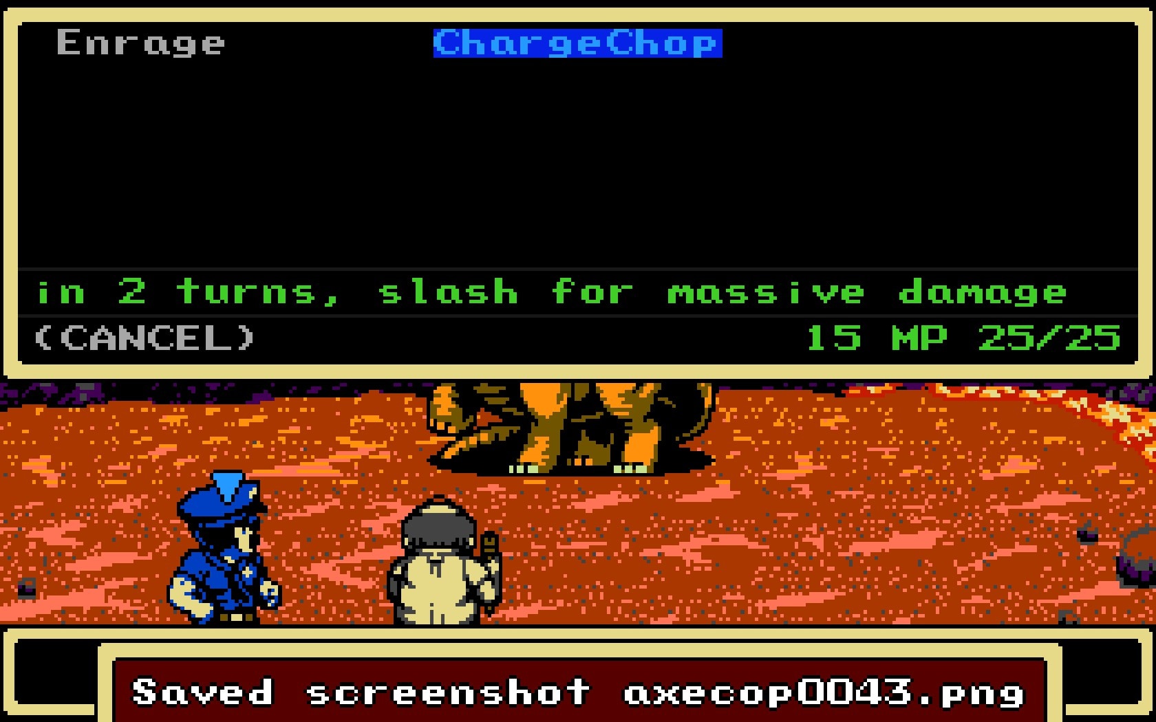 This move has Axe Cop charge up for a couple rounds before attacking on the third for massive damage. He's stuck in charging so the other Good Guys might have to pour Soda on him as he skips his turns while charging for the attack. It might be his signature move too, because he says his catchphrase when he does it. I think it's for use after self-buffing and then hitting a boss with. For normal enemies it would be faster to use the normal attack since their hp pool isn't big enough to require this move.