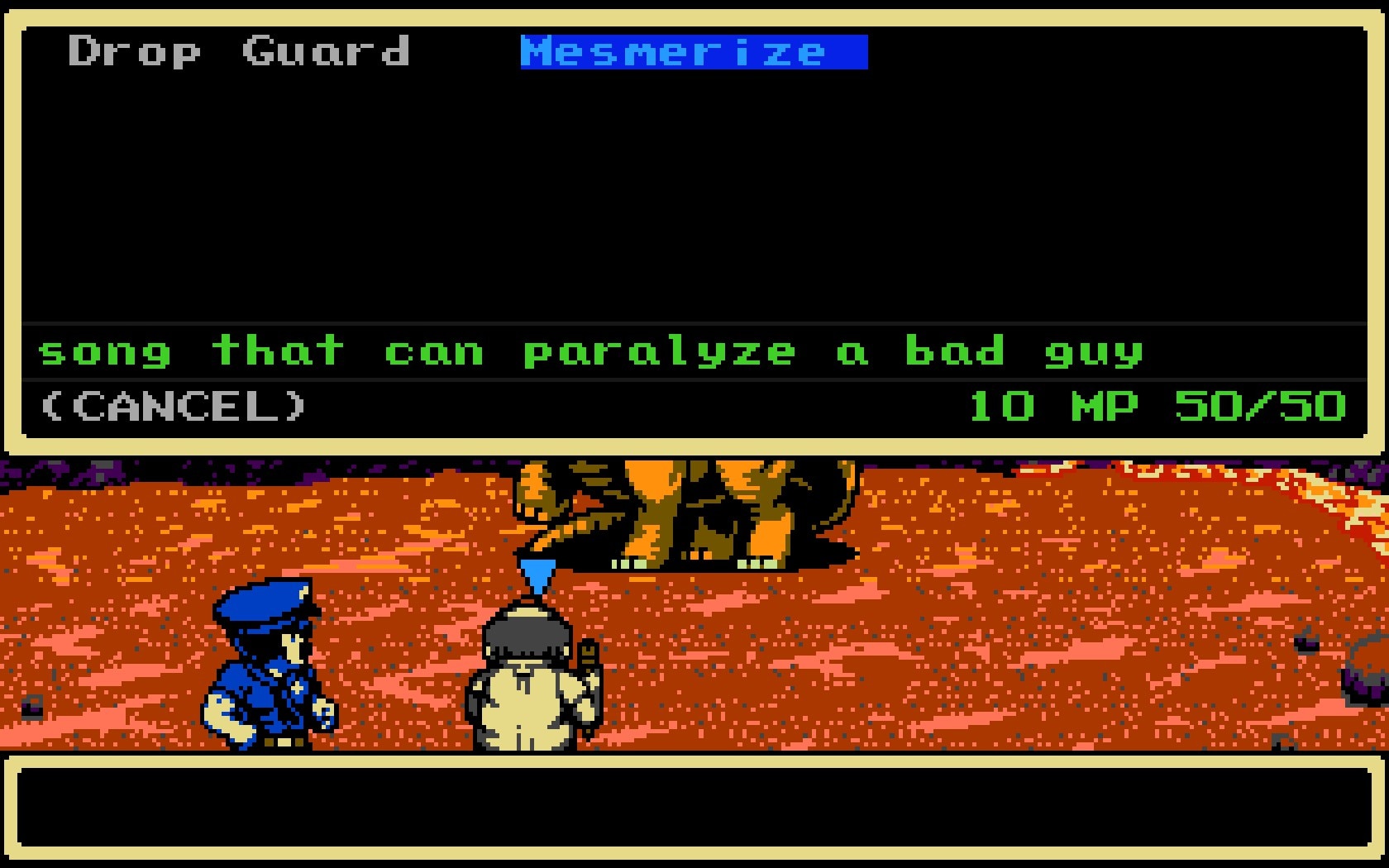 Here are Flute Cop's special moves. The first lowers defenses. I think it's not so good, but it may be that these low level Bad Guys don't have enough Defense stat to make lowering it useful. It made a small difference with bosses, so maybe later Missions will have Bad Guys who have a tough Defense stat to make it useful.